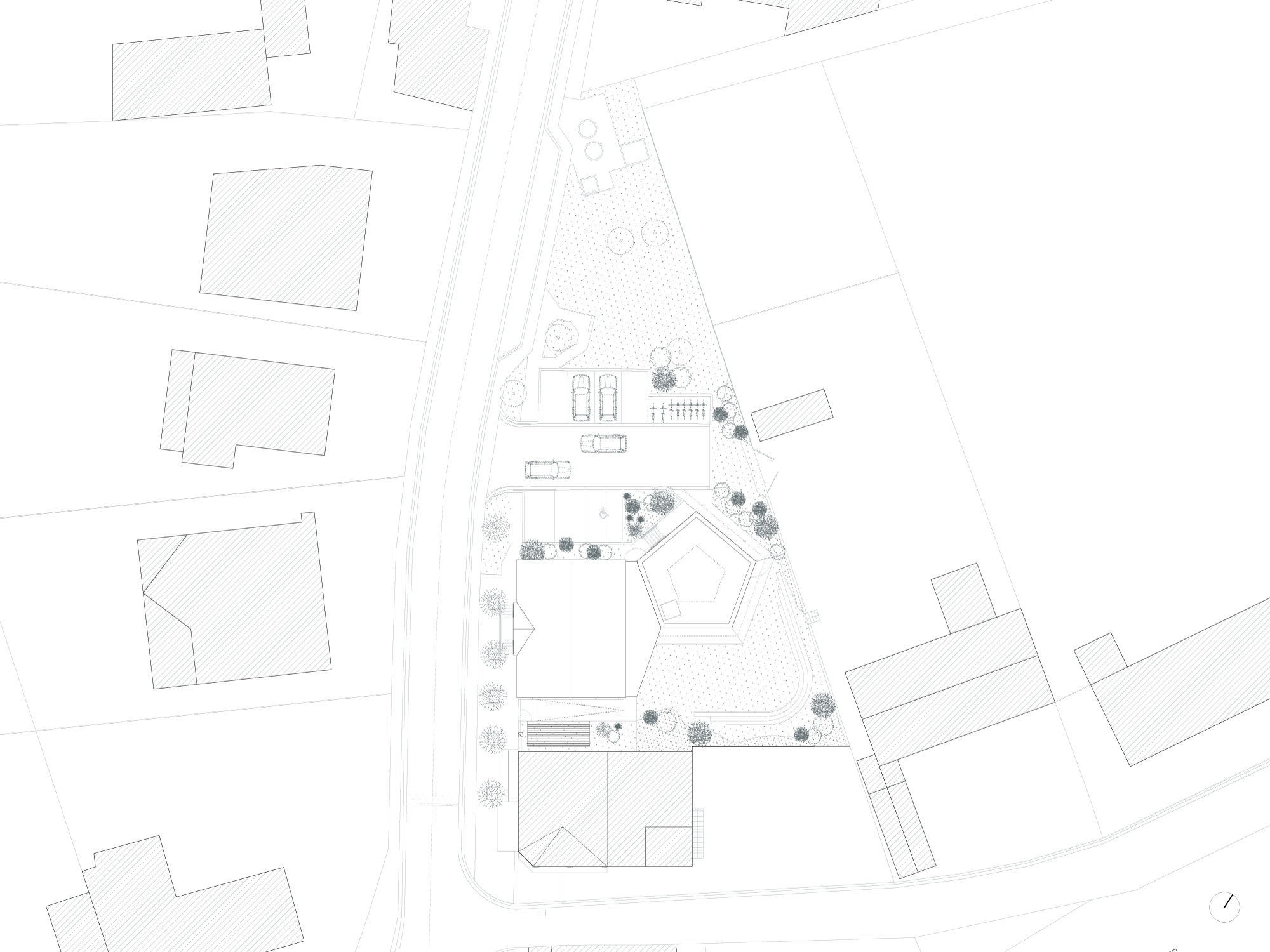 Het centrum van Borchtlombeek heeft een historisch dorpzicht. Twee markante gebouw geven het centrum een extra historisch karakter. De boerderij van boer ‘Vekeman’ ligt langsheen het kerkplein en de Knoddelstraat. De boerderij wordt gekenmerkt door een lange schuur met puntgevel in rood metselwerk. De stallen en het woonhuis zijn wit gekalkt en buigen af richting de Kerkweg. Een schakeling van gebouwen in rood en wit. Tegenover de boerderij ligt centraal in het dorp de Sint-Amanduskerk. Deze laatgotische kerk is opgetrokken in zandsteen, de zijbeuken in rood metselwerk. De hoeken van de rode zijbeuken worden geaccentueerd door een kettingverband in witte zandsteen. De kerk vormt een historisch koppel van een witte hoofdbeuk en rode zijbeuken. Deze historische tweeledigheid nemen we mee om het derde historische gebouw, het Oud Gemeentehuis van Borchtlombeek, als koppel te ontwerpen.