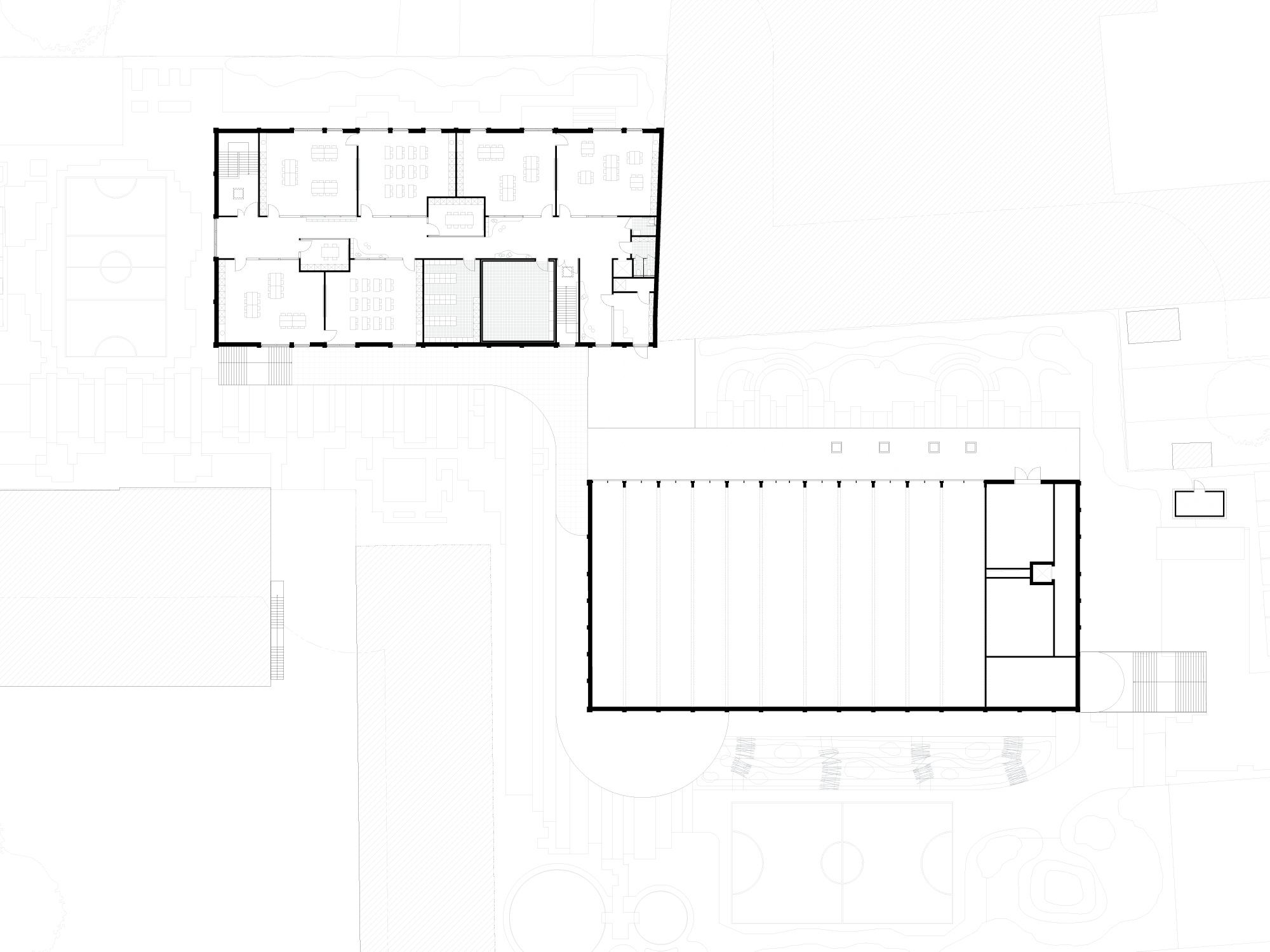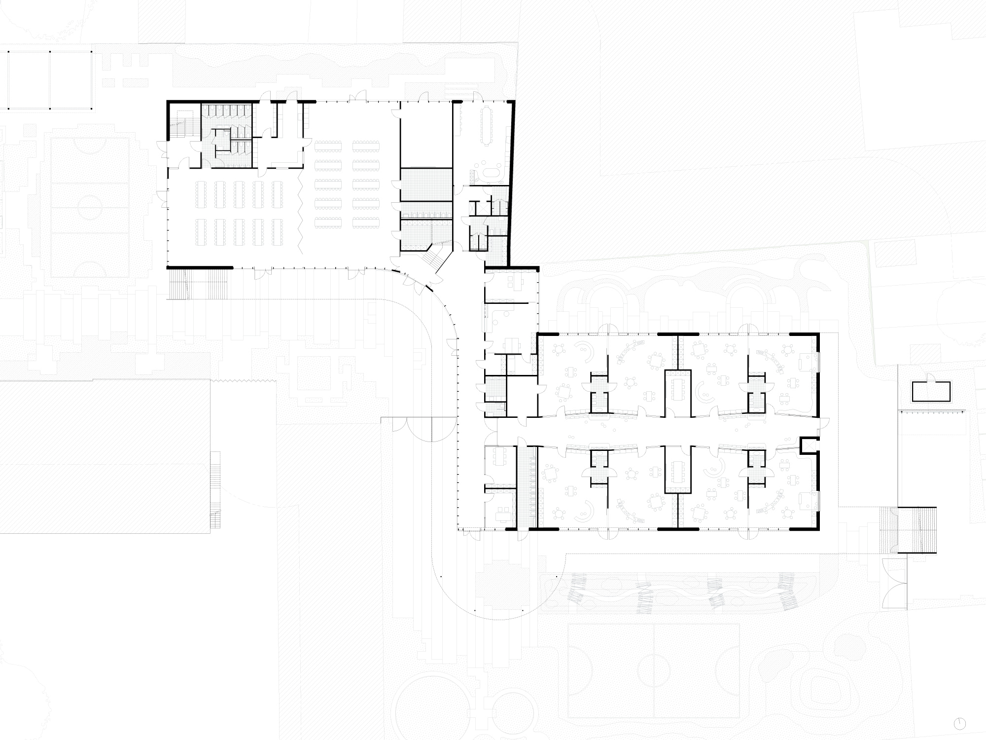Na sloop van deze oude gebouwen ontstaat heel wat kwalitatieve vrije ruimte. Deze willen we zoveel mogelijk vrijwaren. Om de impact van het nieuwe programma op de site te beperken opteren we ervoor het programma in 3 compacte bouwlagen te stapelen. Het was onze uitdrukkelijke wens om af te stappen van de huidige inplanting die de site opdeelt in een voorzijde en een achterzijde. Het nieuwe gebouw, bestaande uit twee volumes, moet fungeren als verbindend element op de site.