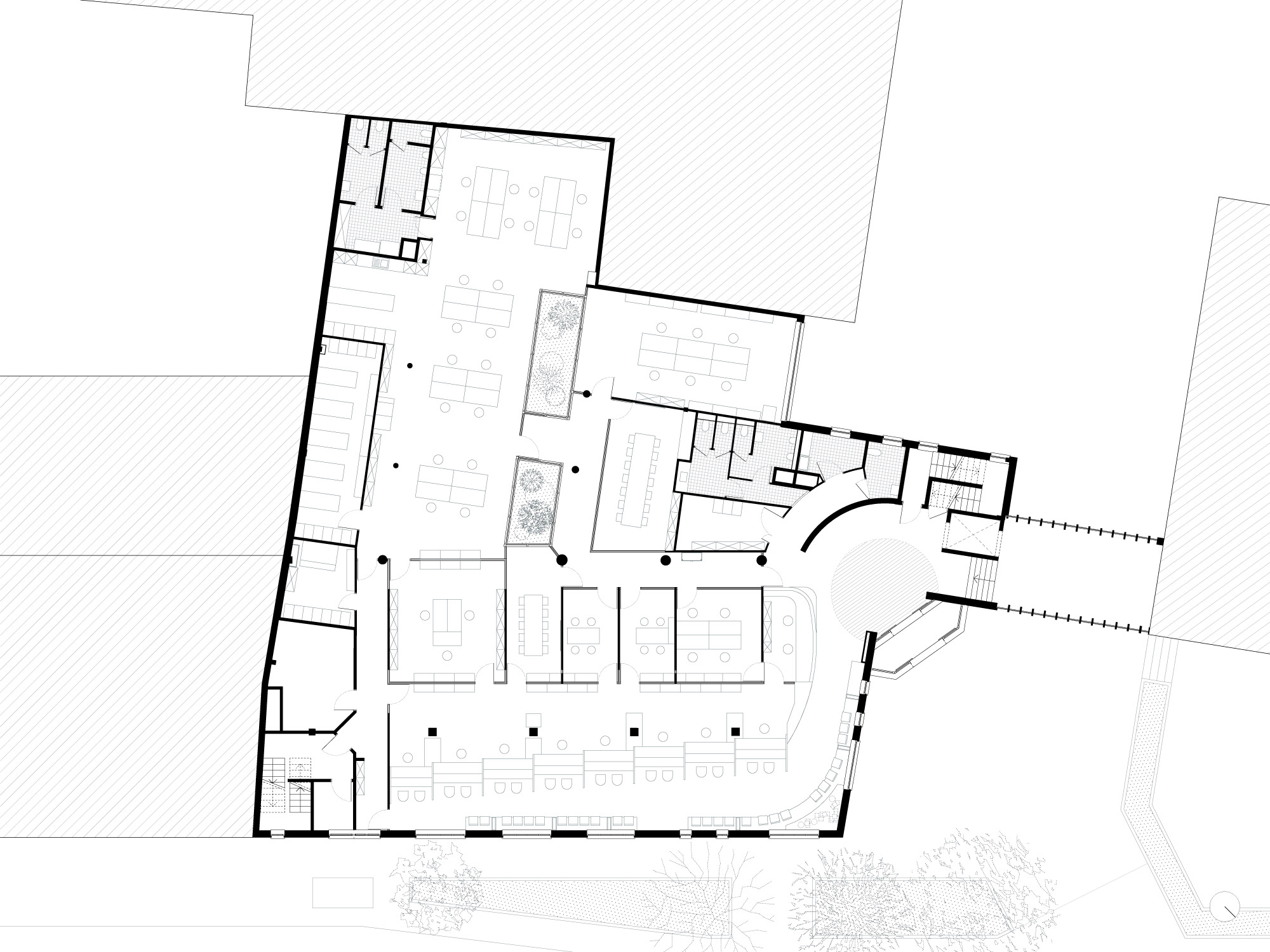 De patio in het kantoorgedeelte werd ontworpen als een groene oase in het hart van het gebouw. Het biedt een aangename buitenruimte en brengt vooral veel daglicht en rust binnen in het voorheen donkere gebouw. De groene invulling bestaat uit een gevarieerde selectie van planten en struiken die een natuurlijke en uitnodigende sfeer creëren. De patio is toegankelijk en vormt een verlengstuk van de open kantoorruimte, waardoor het binnen en buiten op een harmonieuze manier samenkomen. Bovendien biedt de patio toegang tot het dak. Achteraan bevindt zich de open kantoorruimte met een gezellige koffiehoek en werd ook het archief en de technische ruimte ondergebracht.